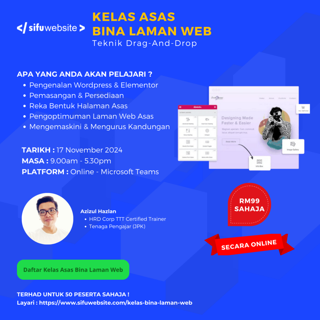 Hanya 50 tempat tersedia untuk kelas ini, dan tempat semakin terhad! Jangan tunggu lagi, ini adalah peluang terbaik untuk anda belajar cara mudah membina laman web menggunakan WordPress dan Elementor tanpa perlu menulis kod.